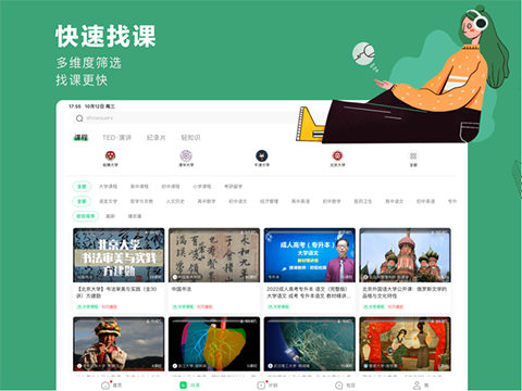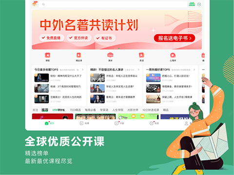 作为中国最大最全的课程视频平台,拥有来自国内外顶尖学府的海量名师名课,覆盖文学艺术、历史哲学、经济社会、物理化学、心理管理、计算机技术等二十多个专业领域;作为TED官方合作伙伴,向国内用户提供最新最赞的TED演讲;引人入胜又发人深省的纪录片、轻松易学的可汗学院,无数好内容就在这里等着你。