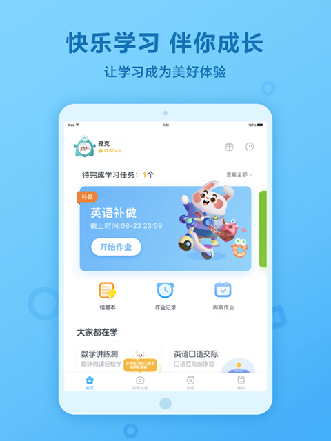 一起作业学生端ipad版深受广大学生和家长的喜爱,软件能够通过自学练习,让孩子即时巩固课内知识,还能通过读写训练来提高语文和英语口语、听力能力。在这里,可以让广大的小学生体验到快乐学习、趣味学习的真谛。在有趣游戏的同时就把作业轻松完成了。