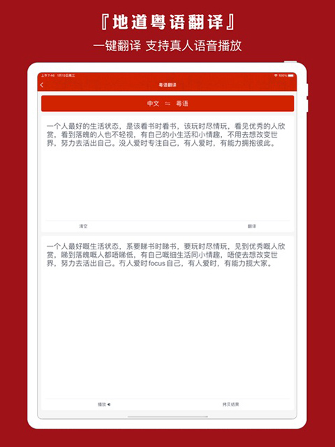 1、粤语翻译,普通话翻译成粤语,支持真人语音朗读