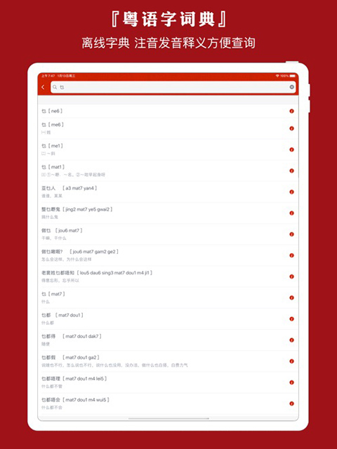 粤语通ipad是一款针对苹果iPad设备打造的一款粤语学习软件。粤语作为中国一门特色的地方语言,想要学习说粤语的朋友也很多。这是一款可以为用户提供常用粤语拼音以及发音的翻译查询,能帮助用户快速的了解粤语,学习粤语的常用词语和情景对话。让你再也不用担心广东话的沟通问题。有需要的用户可以下载使用哦!