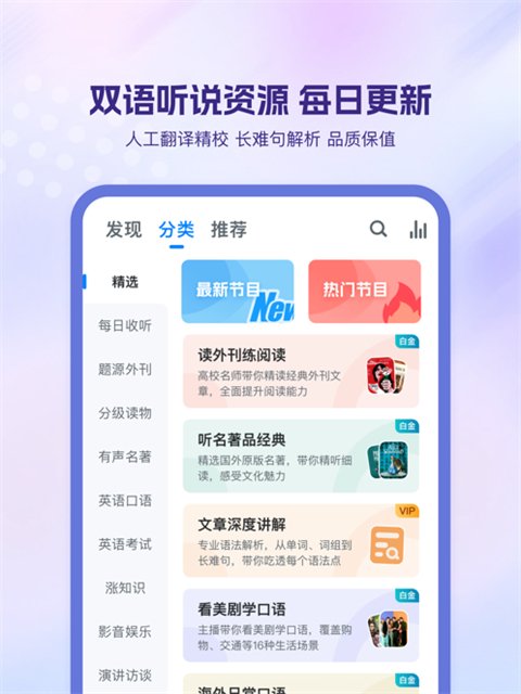 1、海量内容:3000优质英语节目,语音同步双语字幕,超过30万篇有声资源;