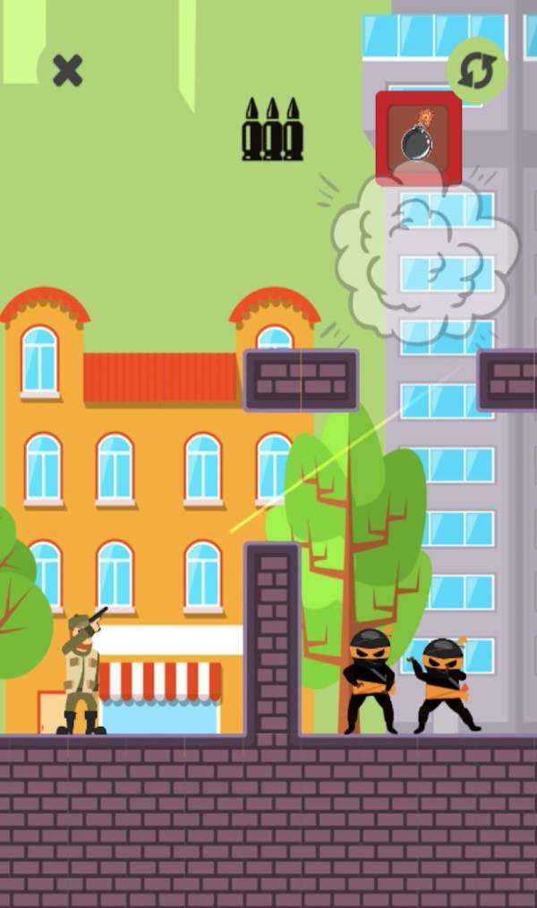 2、玩家在每一个关卡中只能使用三发子弹,三发子弹用完还有敌人存活就需要重新开始。